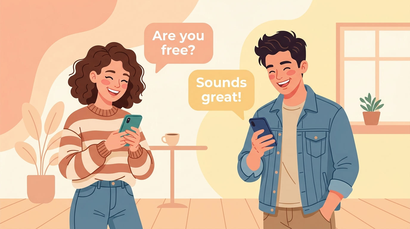 ■ サムネイル — making-plans-a2.png 配置先: public/images/article-thumbnails/making-plans-a2.png 配置先: public/images/articles/making-plans-a2/thumbnail-a.png プロンプト: Flat illustration style, warm pastel background (peach and light yellow), two cheerful young people looking at their phones and smiling, speech bubbles showing "Are you free?" and "Sounds great!", casual and friendly vibe, no extra text in image, 1280×720px